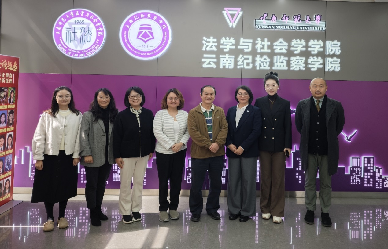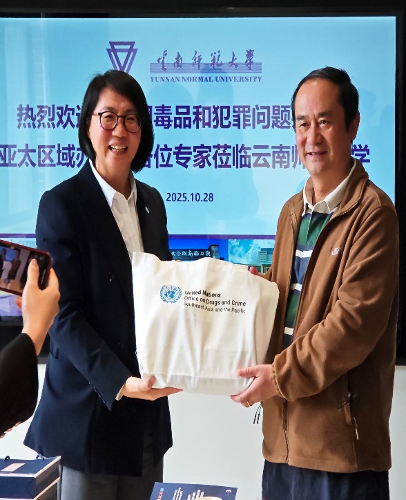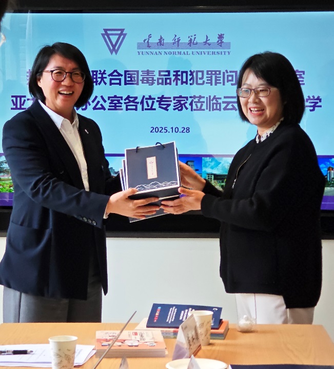 10 月 28 日,联合国毒品和犯罪问题办公室亚太地区办公室(以下简称 “联合国毒罪办亚太办”)项目官员桑黎丽一行莅临云南师范大学法学与社会学学院,围绕 “东南亚地区禁毒宣传教育资料开发合作” 召开专题座谈会。会议由法学与社会学学院院长杜敏菊教授主持,学校党委常委、纪委书记孙剑同志致欢迎辞,联合国毒罪办亚太办团队、法学与社会学学院莫关耀教授及相关教师代表参会。