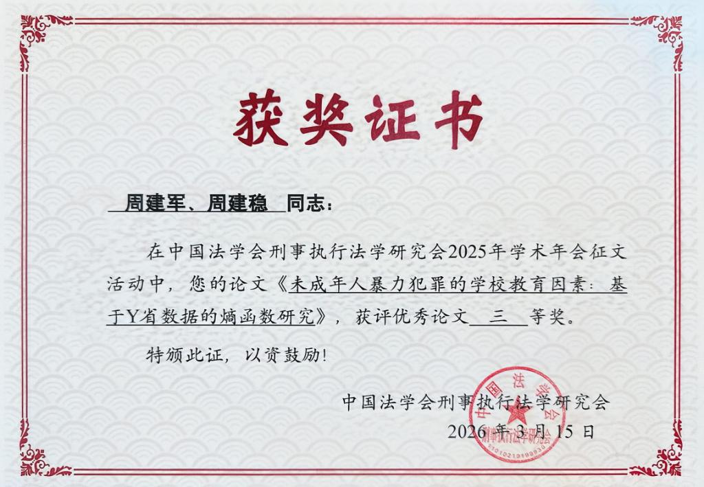 此外,3月15日,周建军教授的论文《未成年人暴力犯罪的学校教育因素:基于Y省数据的熵函数研究》,在全国性学术交流中荣获中国法学会刑事执行法学研究会2025年学术年会征文优秀论文三等奖。两项成果均体现了学科科研工作的扎实作风,为学科建设提供了有力支撑。
