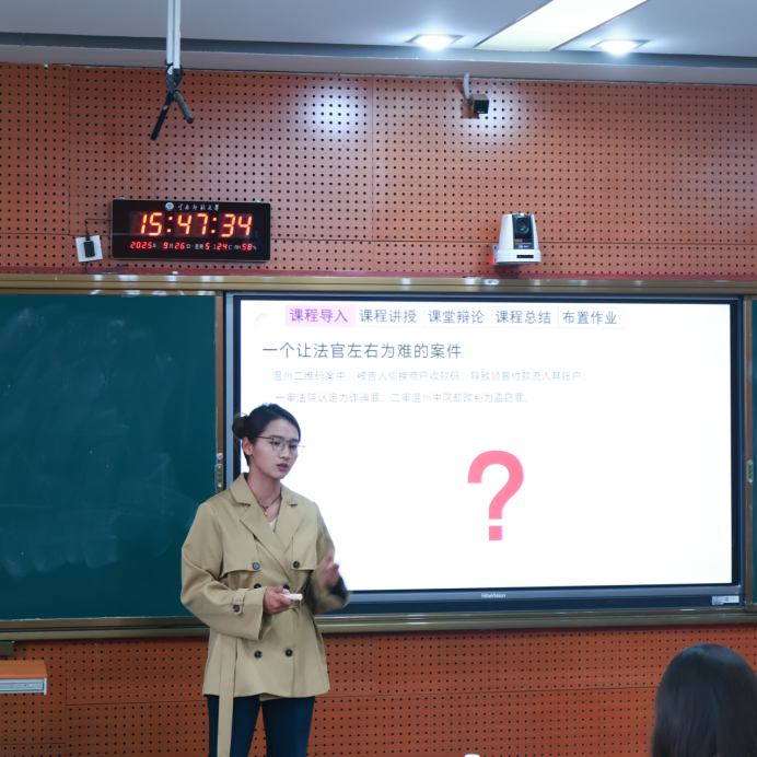 比赛以“模拟课堂教学”为核心,参赛选手需在指定时间内完成知识点讲授,涵盖教学目标拆解、教学环节设计、课堂互动引导及PPT呈现等环节。在比赛中,法学专业选手围绕“走进民法典:保护人身权”、“刑法中正当防卫的构成要件”等核心知识点展开,通过案例分析将抽象法条具象化;社会工作专业选手则展示“全等三角形”、“望庐山瀑布”等内容,从不同角度展示别样的风采。选手们教态从容、逻辑清晰,部分选手创新采用“小组讨论”、“情景模拟”等教学方法,充分展现了扎实的专业功底与灵活的教学应变能力。